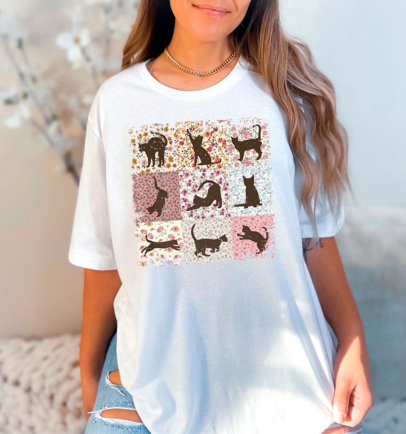 Boho Cats Shirt – Cat Mom T-Shirt – Cottage-Core Floral Kittens Tee – Retro Cat With Flowers Shirt – Vintage Wildflower Cat
