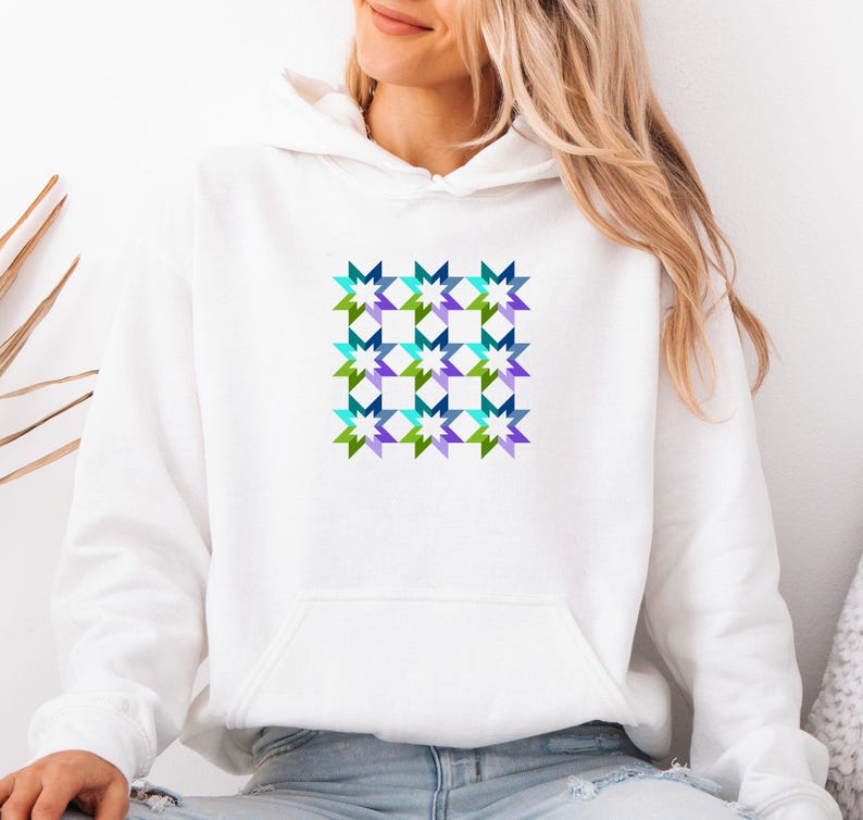 Geometric Star Print long sleeve Hoodie, Star Quilt Pattern Print, Quilters Hoodie