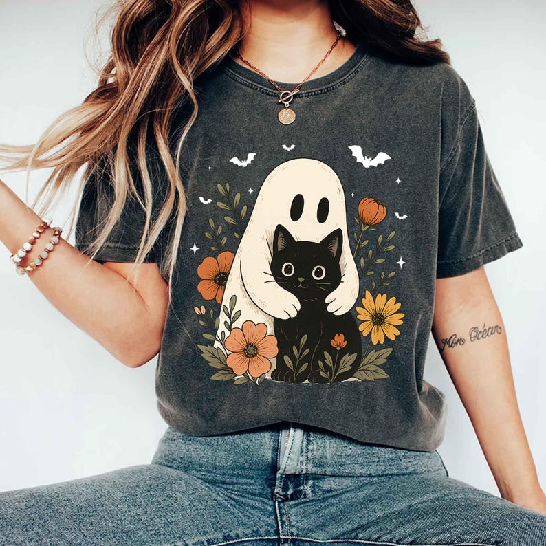 Halloween Black Cat And Ghost Shirt, Halloween Ghost Shirt, Spooky Season Cat Tee, Halloween Cute Women Outfit